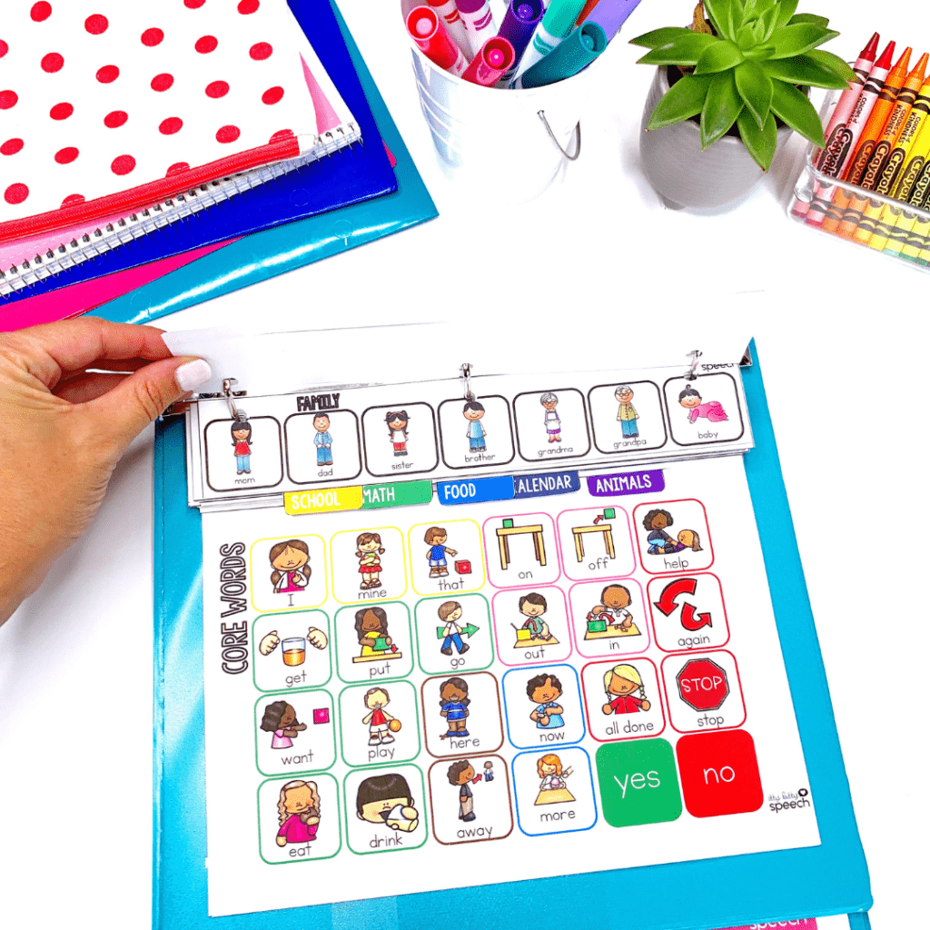 Core Vocabulary Flip Book (Communication Book) – includes multiple levels of core boards and over 50 fringe vocabulary strips strips