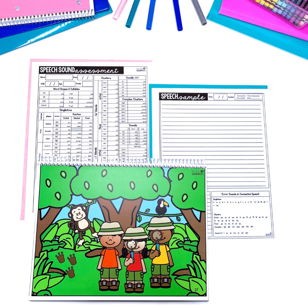 Informal Speech Sound Assessment (Print & No Print Bundle) – assesses singletons in all positions, two element clusters, three element and complex clusters, includes a vowel screener, speech sample prompts, and intelligibility rating