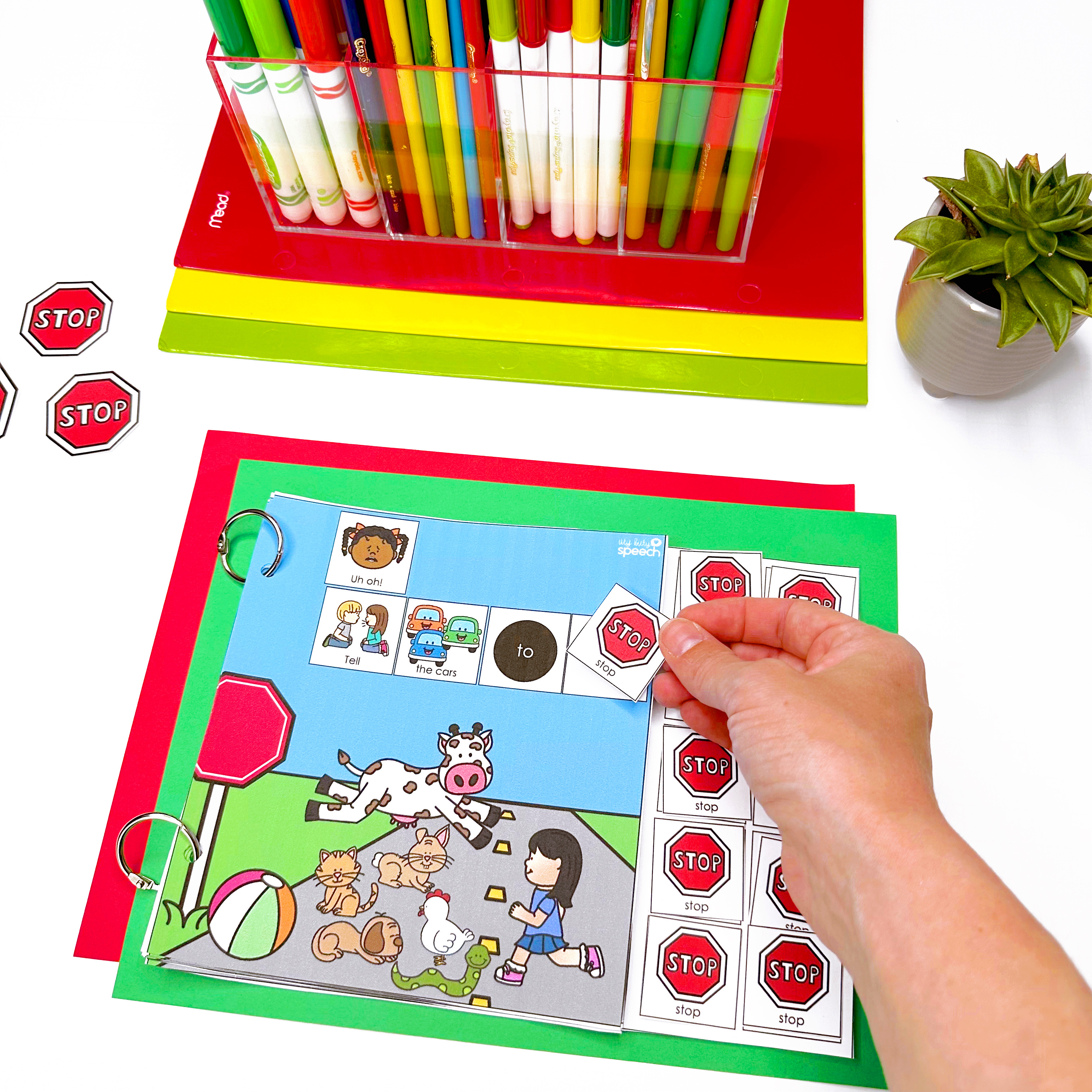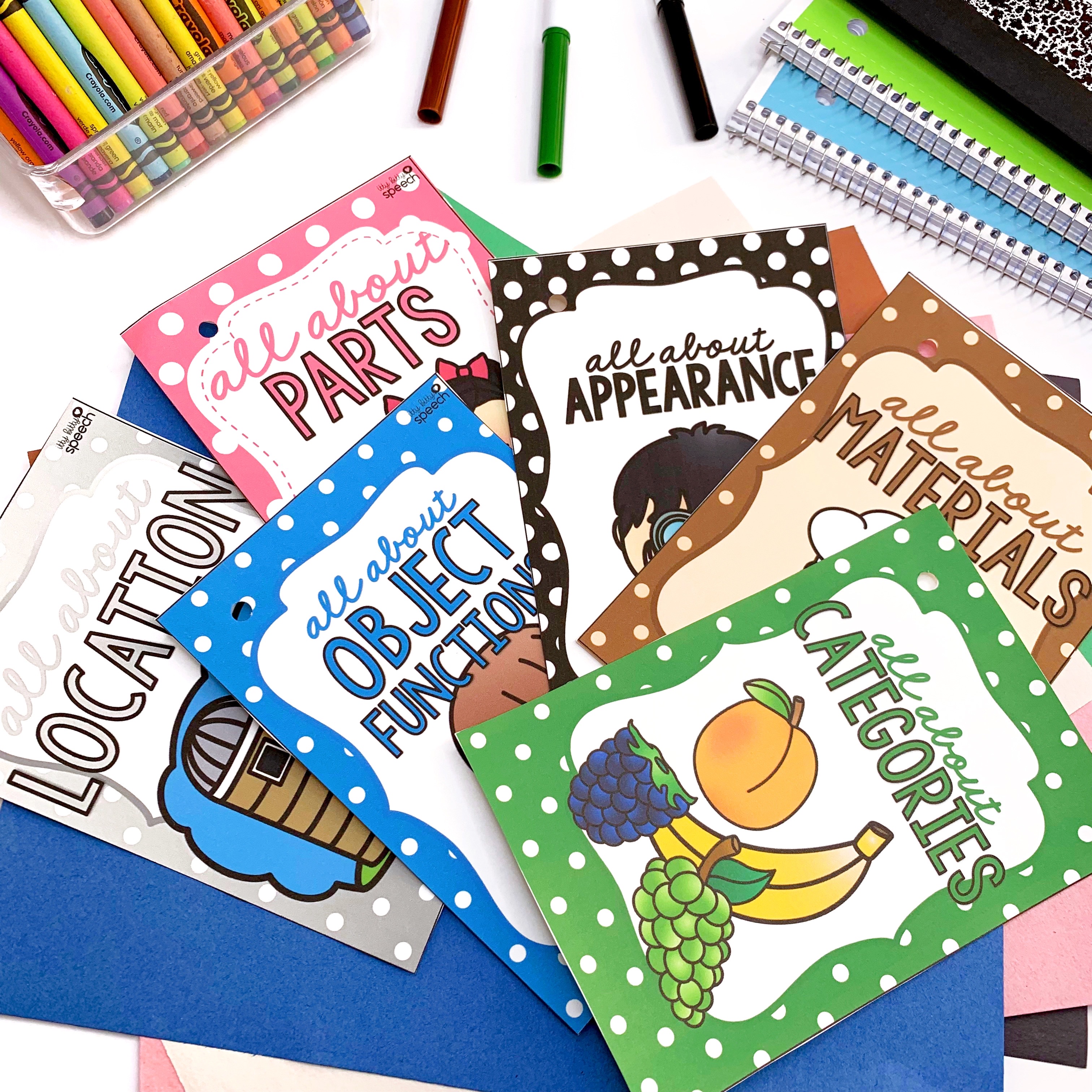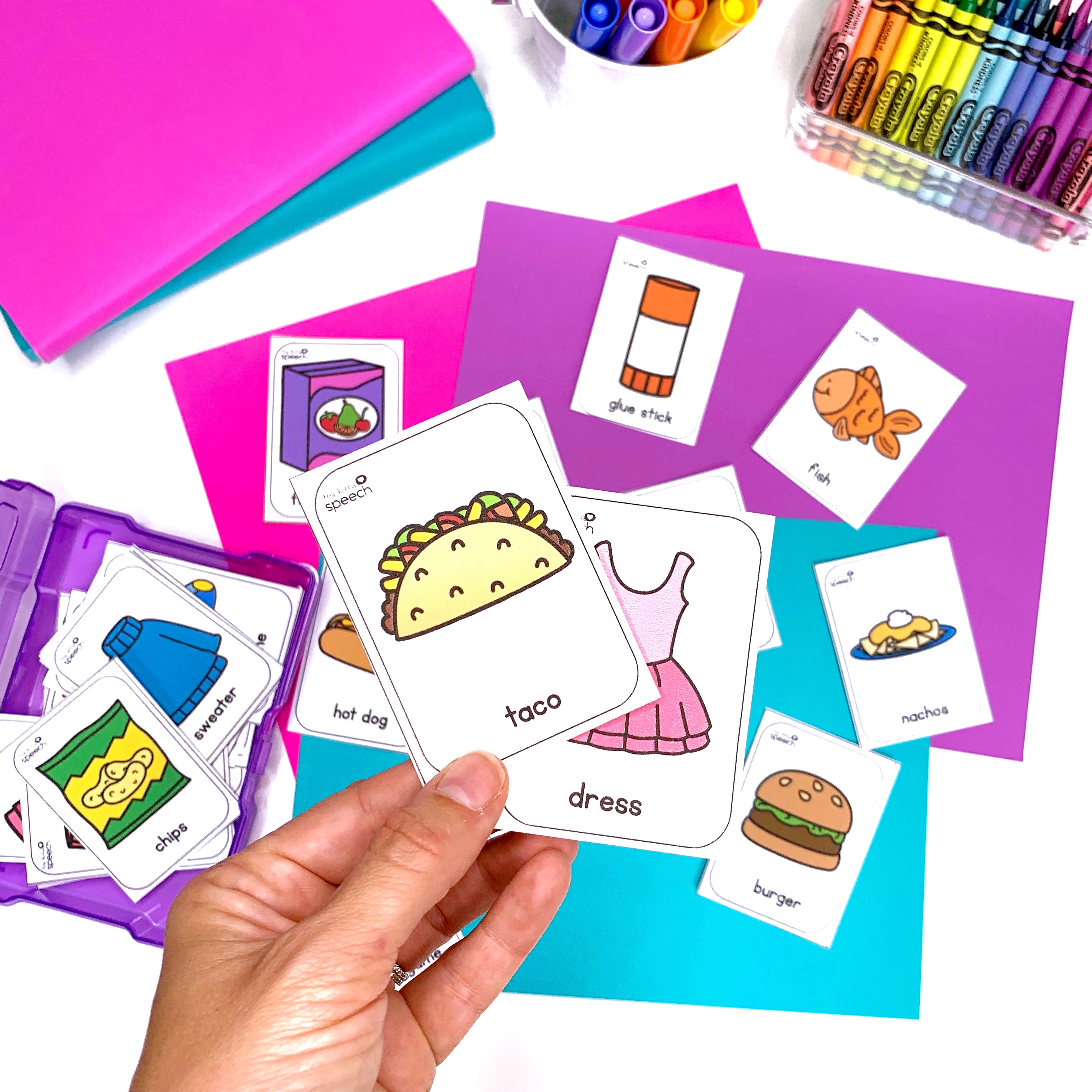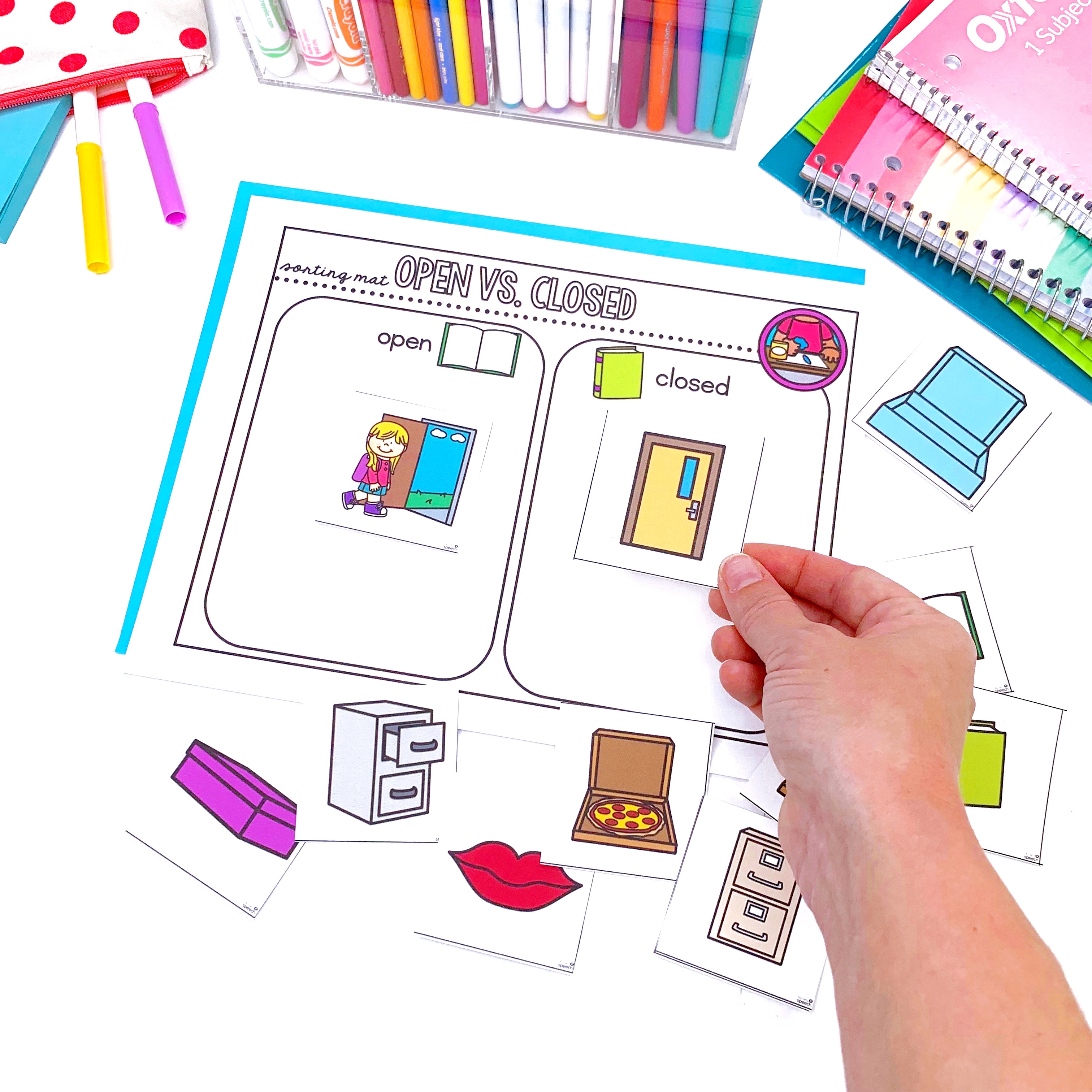 Open Ended Describing Card Deck – use to practice putting together describing skills, labeling, sentence generation, and more! Includes tons of unique and kid friendly pictures.