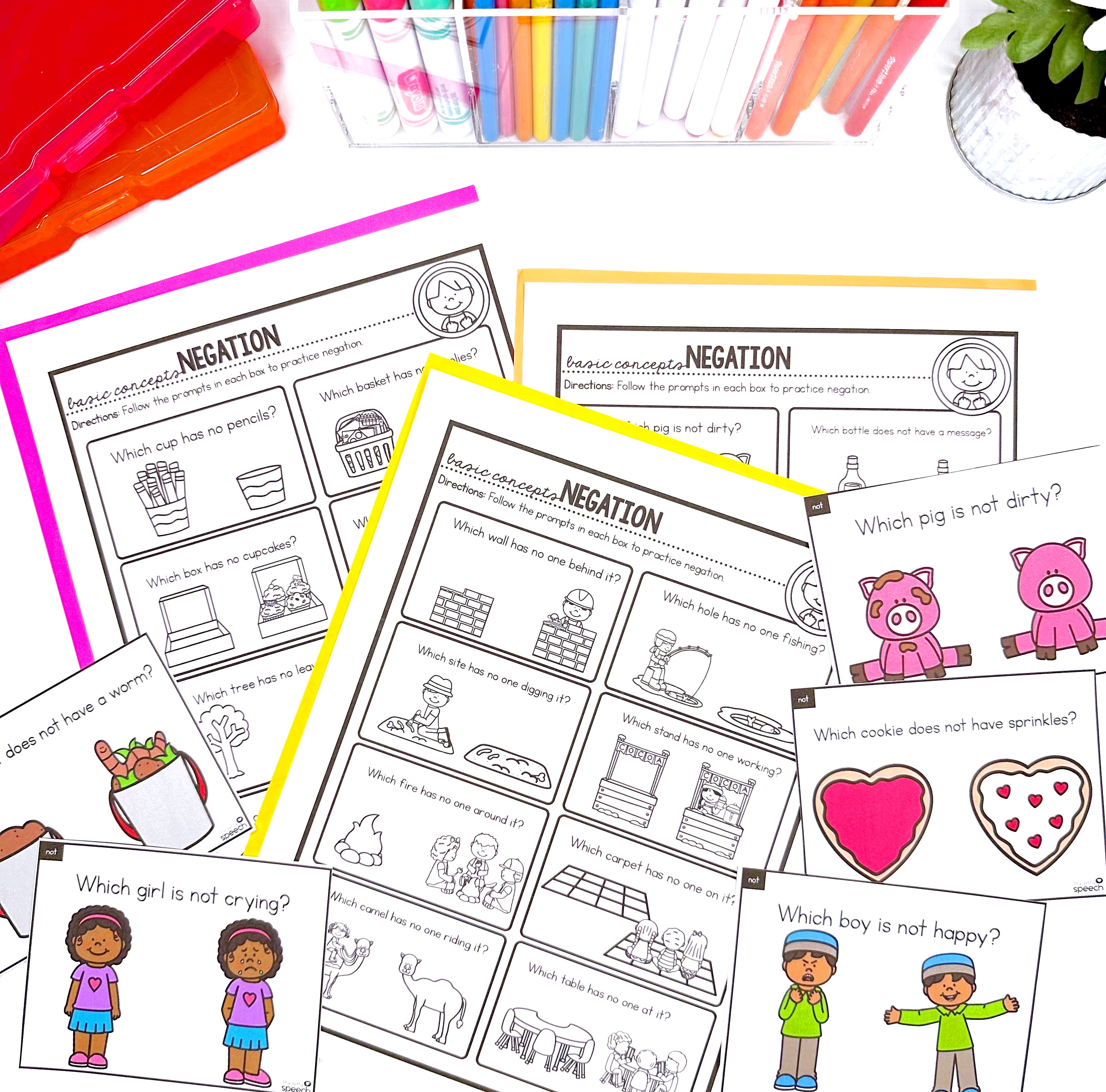 Negation Concepts Kit includes visual anchor chart, sorting cards, task cards, no prep worksheets
