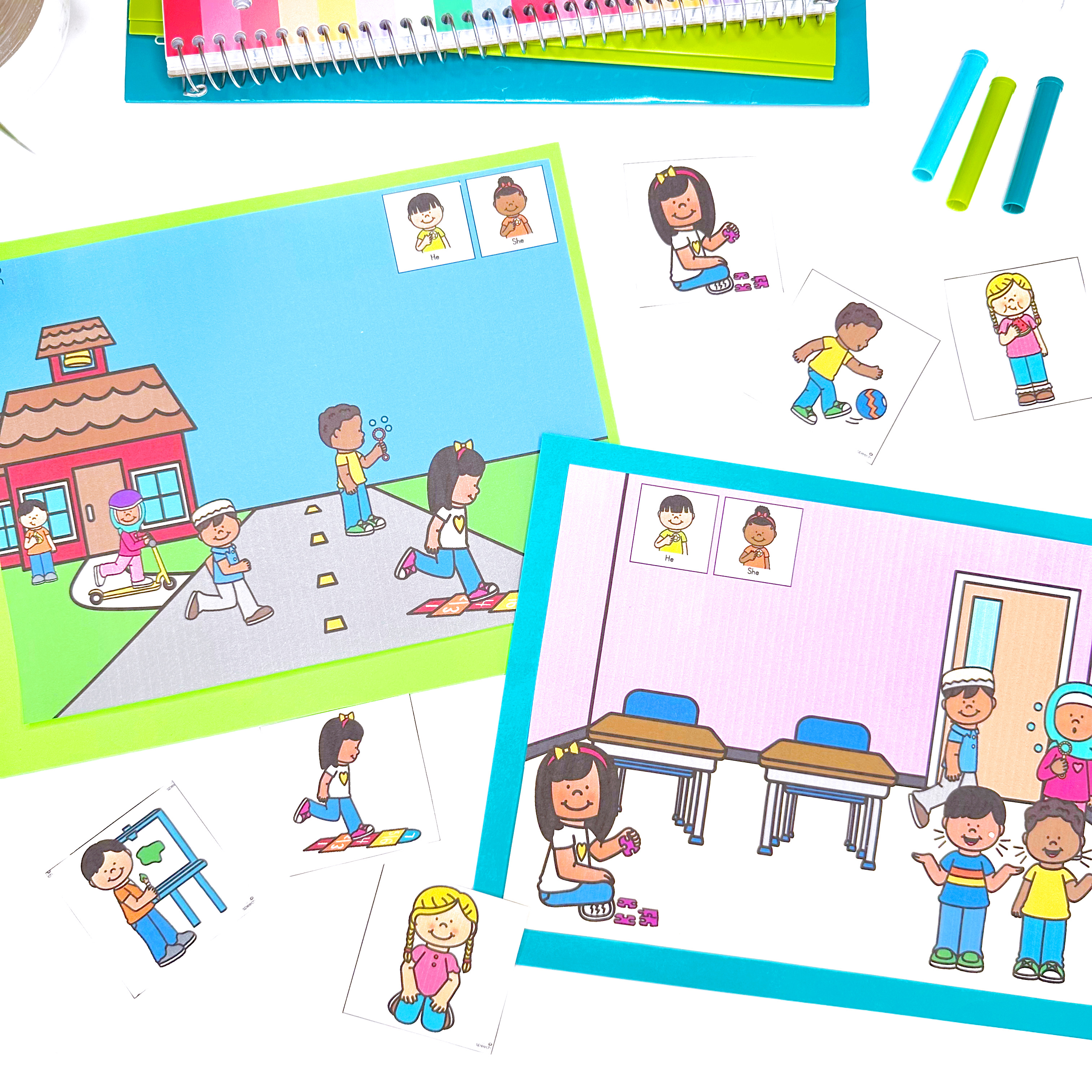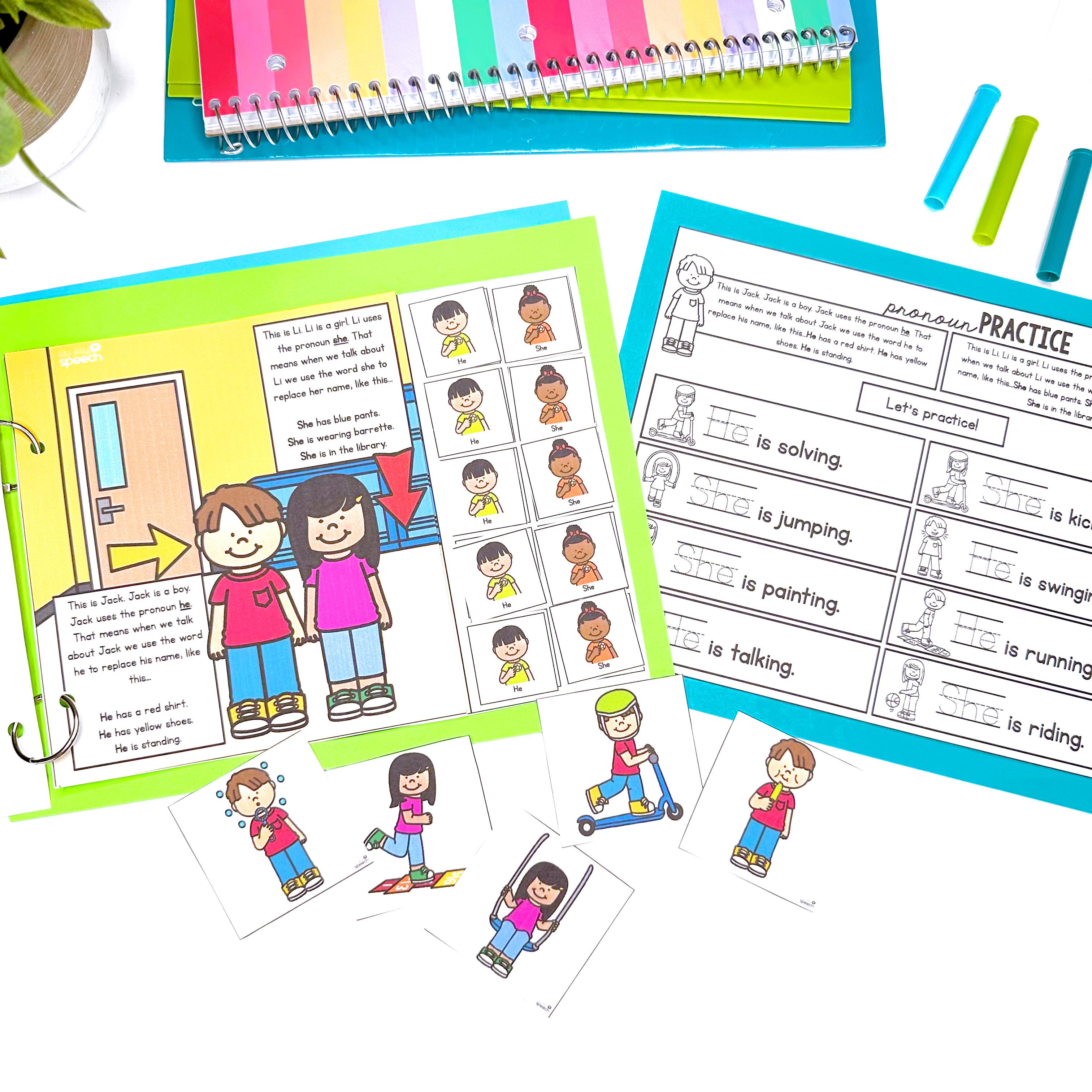 Pronouns Interactive Unit – includes interactive books that teach he vs. she pronouns (6 books total), no prep worksheets in 2 levels, open ended game cards, picture scenes