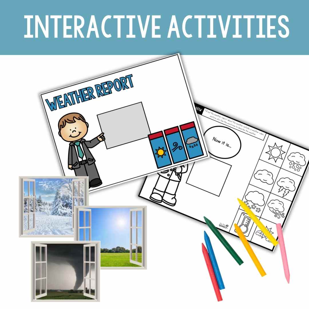 - Weather Report Activity: Students use icons to fill out a weather report and describe what’s happening now. Includes “windows” with a variety of weather scenes.